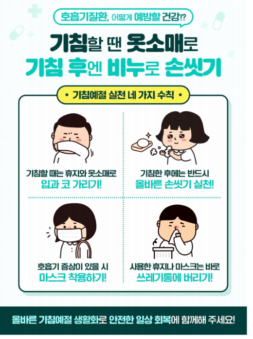 - 손 씻기: 외출 후, 식사 전후, 코를 푼 뒤에는 반드시 손을 씻으세요.
