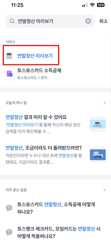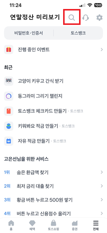 토스 앱을 실행하고 계정에 로그인합니다. - [연말정산 도우미] 기능 선택